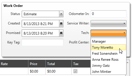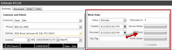 Use the Work Order section of the Estimate or Repair Order windows to assign a technician to a vehicle repair.